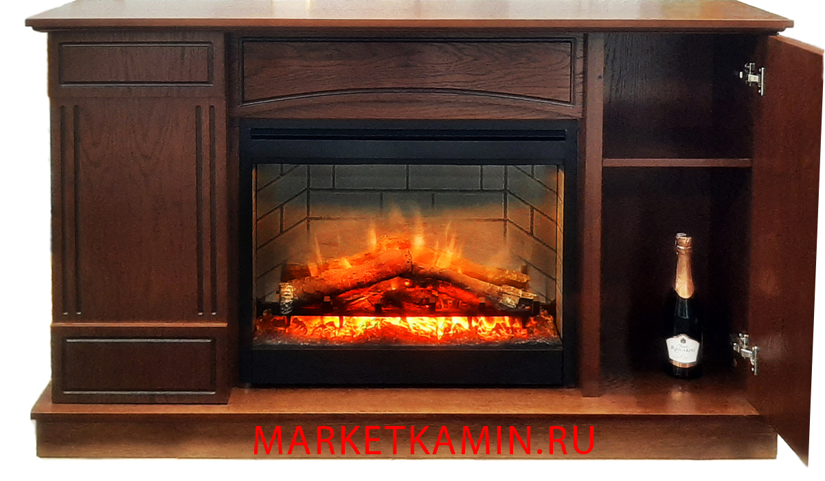 Камин в стиле Современная классика. По бокам имеются открывающиеся от нажатия дверки.  Портал производится в России с использованием настоящего шпона дерева с красивой фактурой и покрывается качественными итальянскими эмалями