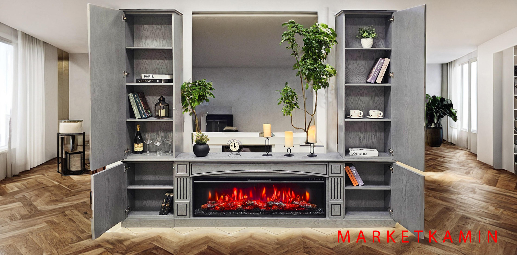 Каминный гарнитур Бельгия со встроенным электрическим камином (серебряный дуб с патиной) Очаги на выбор (дрова/кристаллы/3D живое пламя) Габариты (ШxВxГ)2600x2200x300 мм