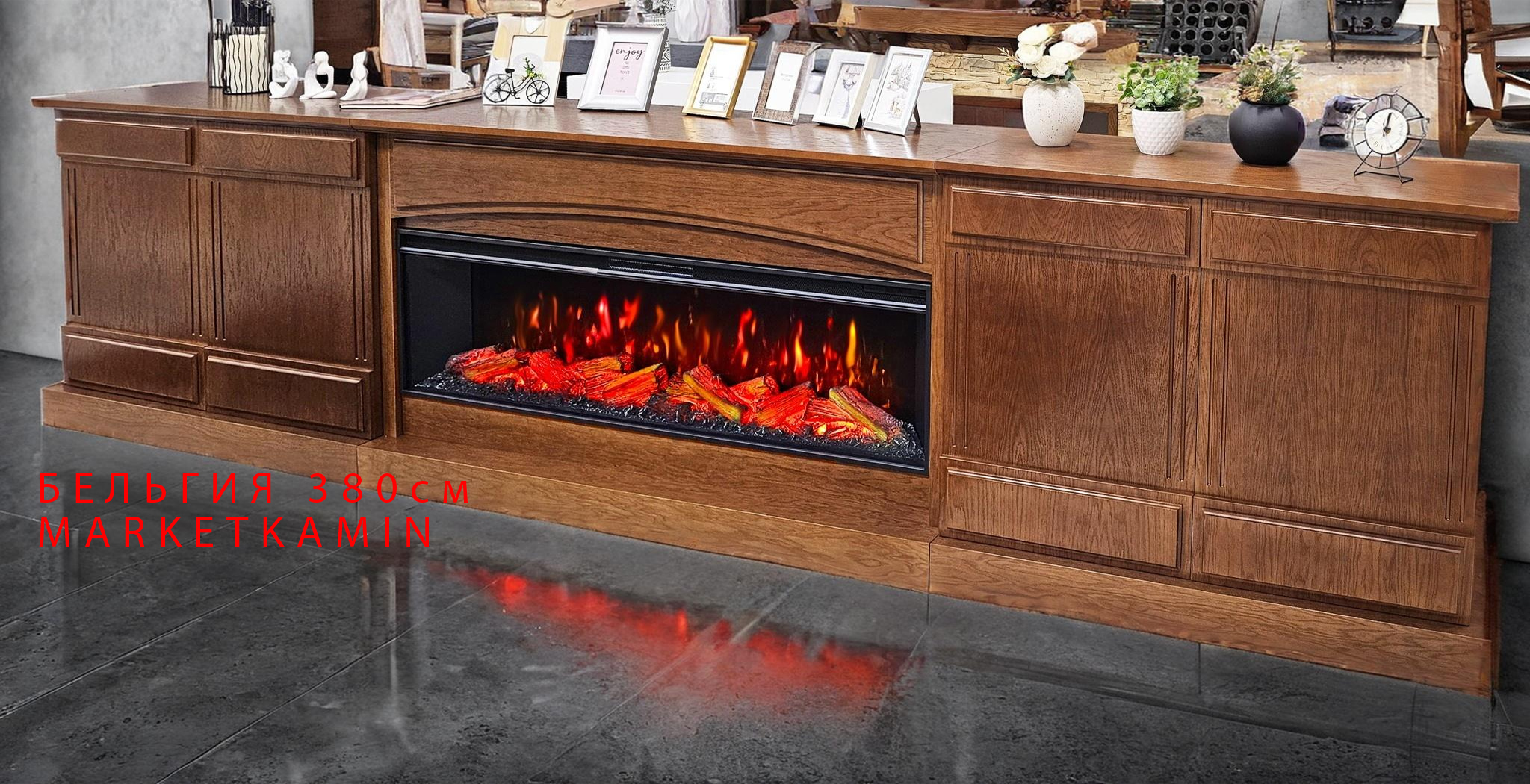 Бельгия сверхширокий (380 см) Камин-бар, ТВ-тумба. Очаги 60″ на выбор (кристаллы, дрова) Габариты (ШxВxГ) 3800x900x450 мм