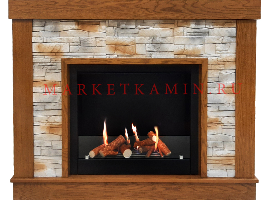 По периметру очага декоративный рельефный камень серо-коричневого цвета
