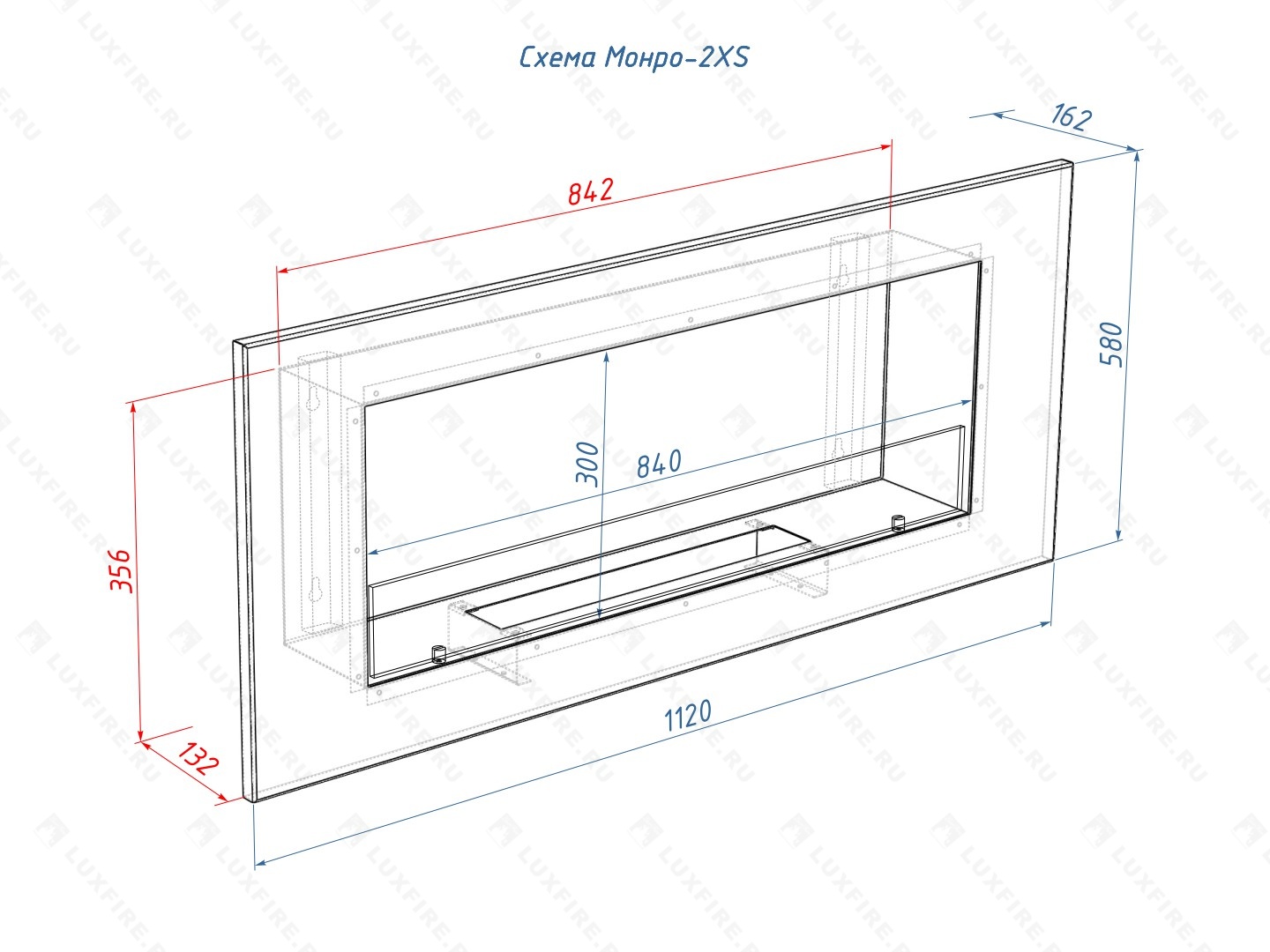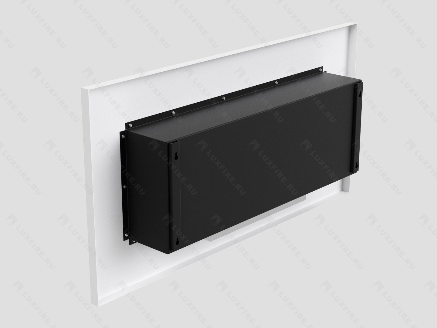 Представляет собой цельную металлическую конструкцию белого цвета класса XS, создающую полузакрытое безопасное пространство для огня с топливным блоком Lux Fire 450 XS ограниченную закаленным стеклом в котором горит живой огонь с углом обзора 180 градусов. Универсально подходит для встройки в нишу или подвеса на стену.