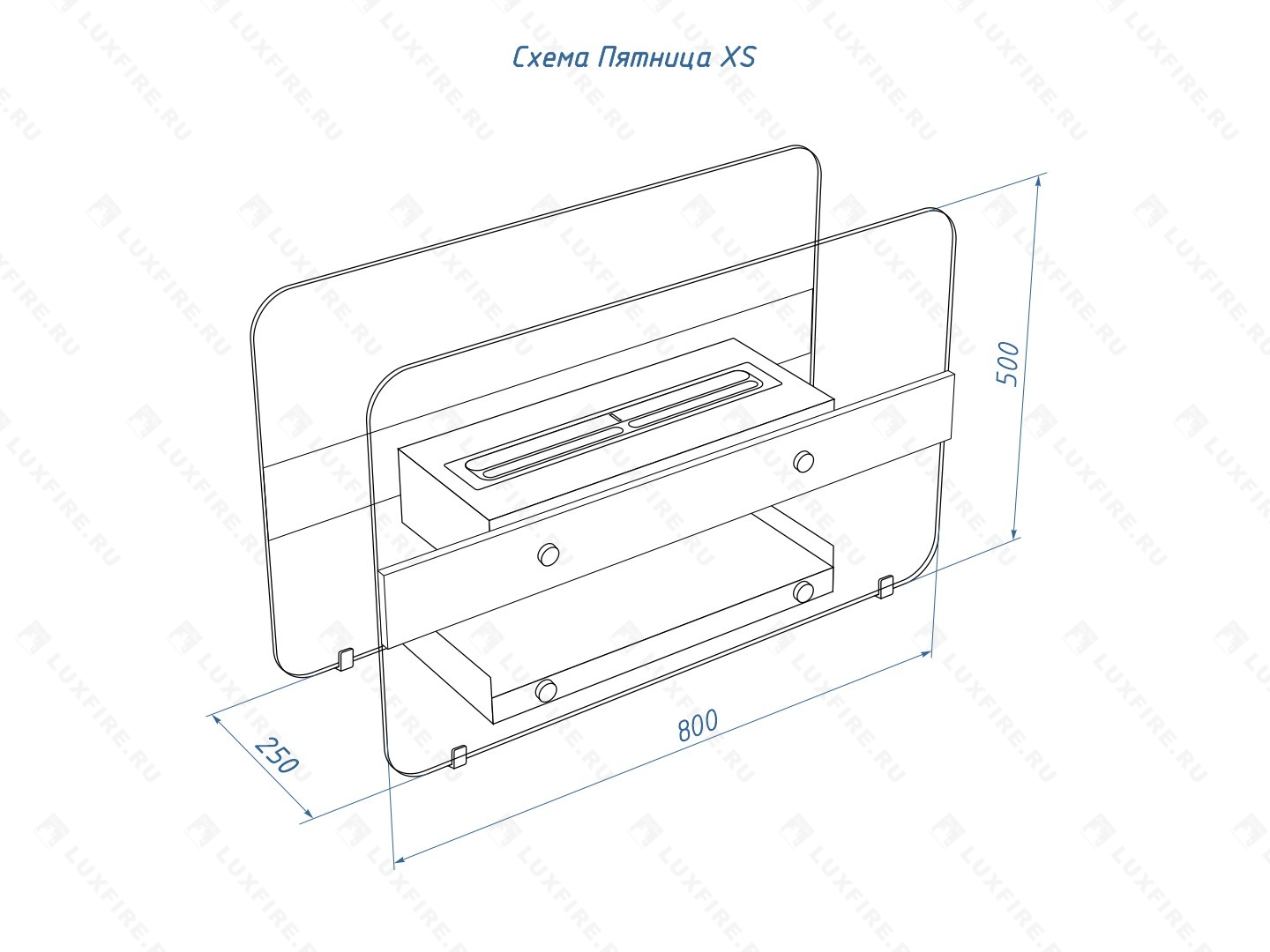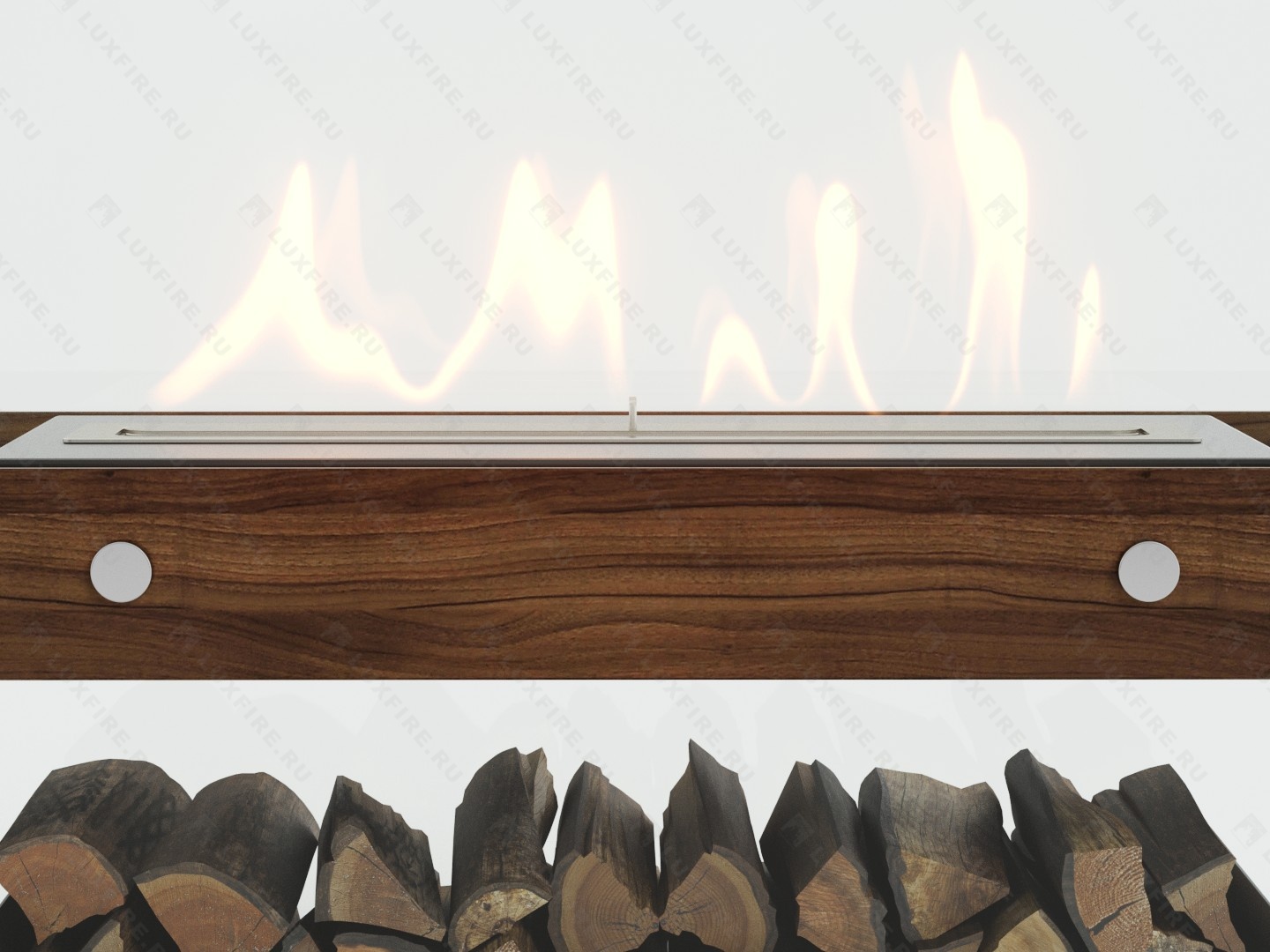 Представляет собой сборную модель оригинального авторского дизайна студии «Vontaren&Grinero» из закаленного стекла и топливного блока Luxfire 450 XS на подиуме, закрепленного на 4 дистанционных держателях. С деревянными натуральными накладками и набором дров с дровницей, обработанных огнебиозащитным средством.