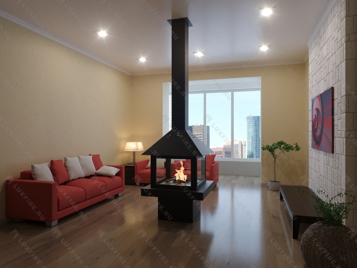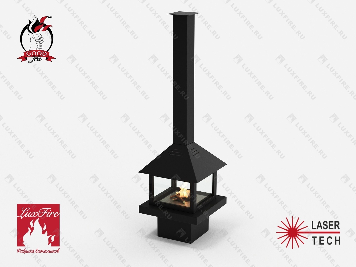 Представляет собой имитацию дровяного камина с трубой. Изготовлен из стали и стекла с топливным блоком Lux Fire 400-2 в полузакрытом пространстве которого горит живой огонь с углом обзора 360 градусов.Телескопический имитатор дымохода подходит к любой высоте потолка и регулируется по длине.