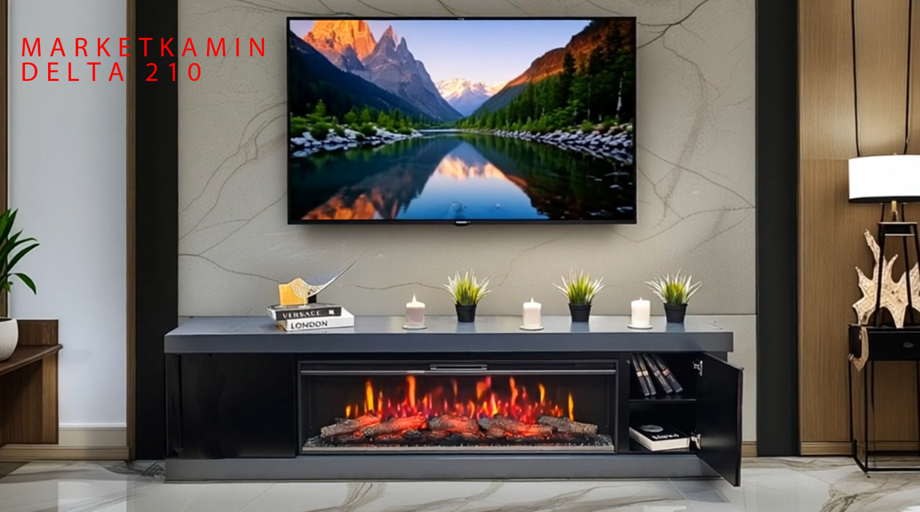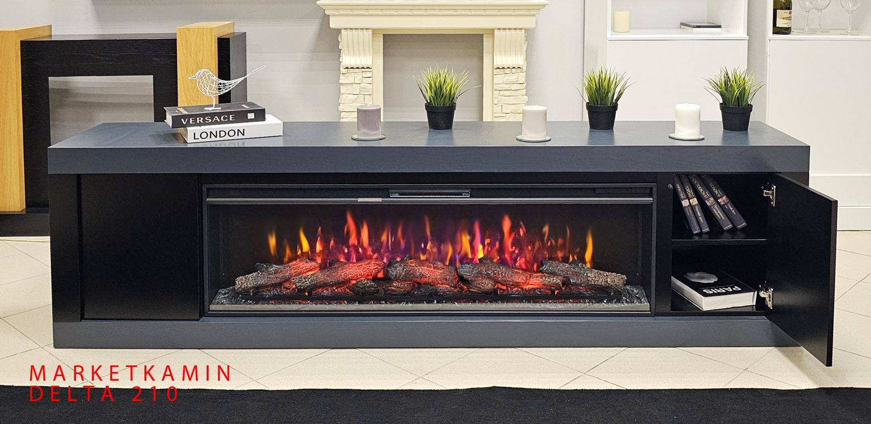 DELTA тв-тумба с камином (Дельта с дверками, антрацит/чёрная эмаль) Очаги 50″ на выбор (дрова/кристаллы/3D эффект живого пламени) Габариты (ШxВxГ): 2100х620х400 мм