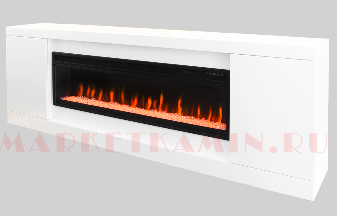 Доминго. Камин-бар с дверками (белая эмаль) широкие очаги 60″ на выбор (дрова/кристаллы/3D живое пламя) Габариты (ШxВxГ): 2400х800х350 мм