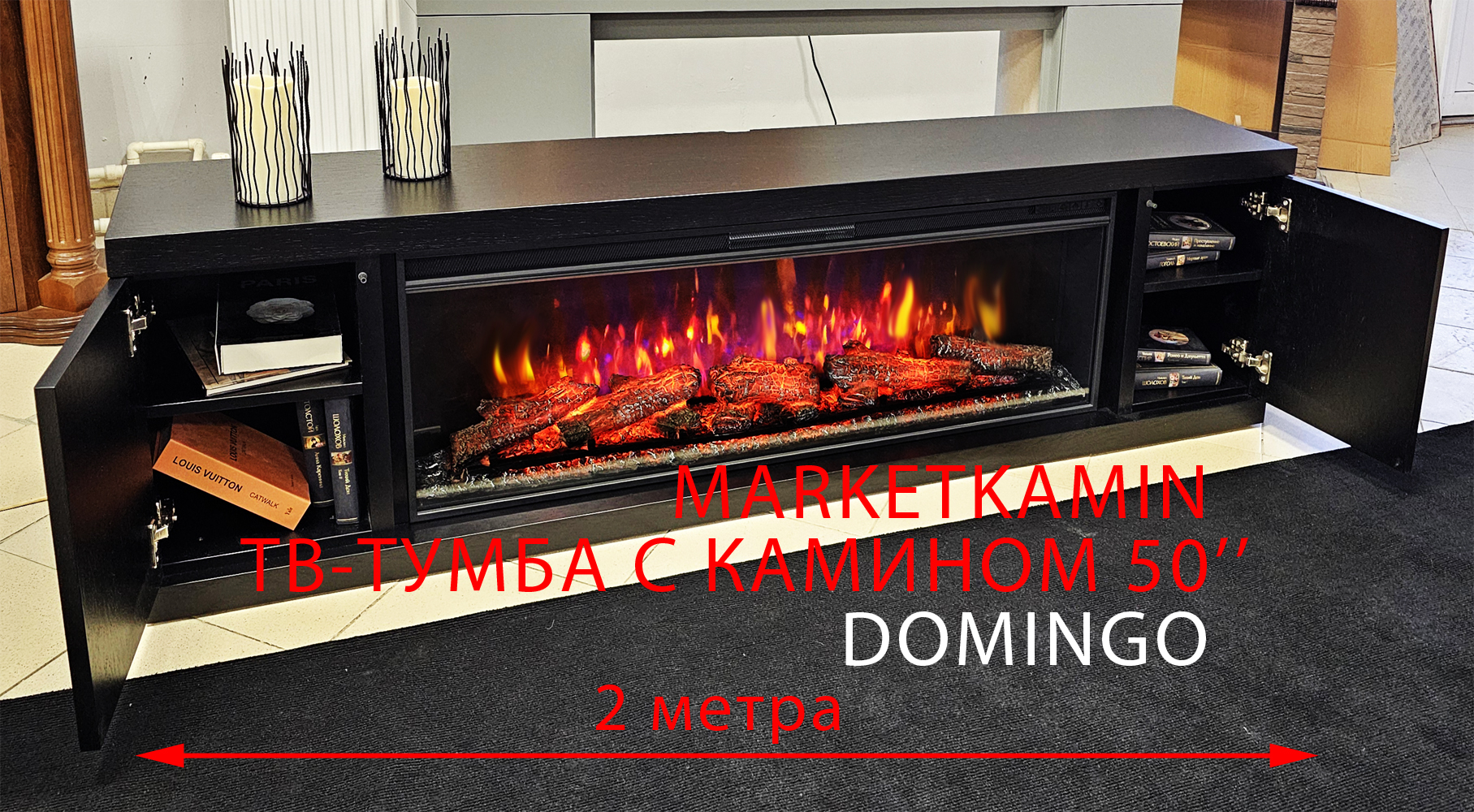 РАСПРОДАЖА ДАННОГО ВАРИАНТА С ОЧАГОМ ФРИСПЕЙС. Доминго ТВ-тумба с камином (чёрная эмаль по шпону дуба) Очаги 50″ на выбор (дрова/кристаллы/3D эффект живого пламени) Цвет и размеры на выбор. Габариты (ШxВxГ): 2000х530х350 мм