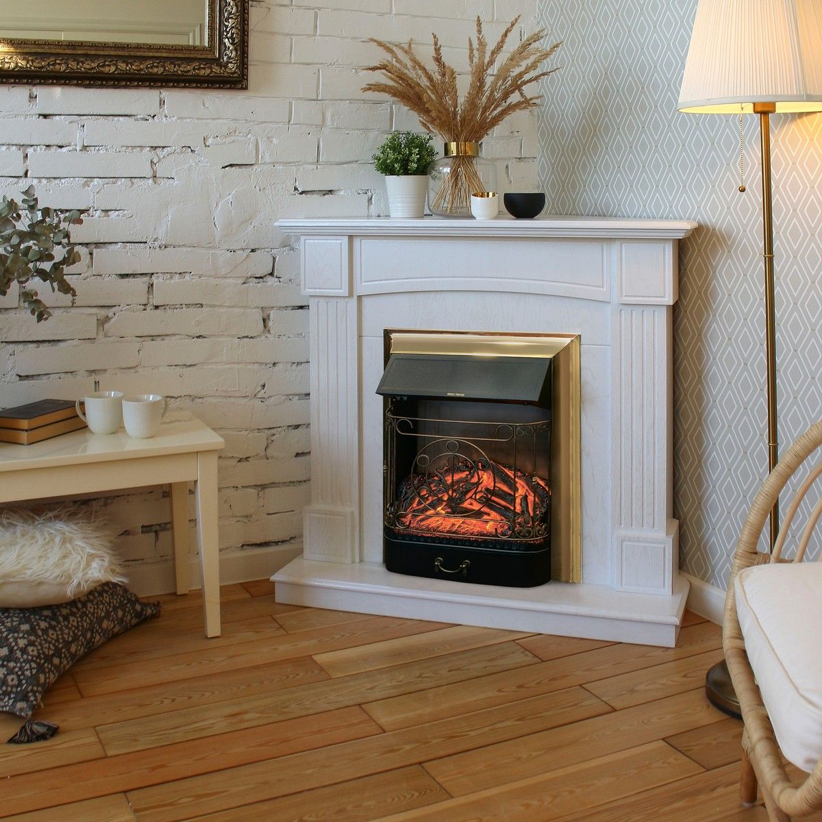 Электрокамин Andrea Corner WT с очагом Majestic Lux Brass. Габариты (ШxВxГ) 104.5×96.5×67 см