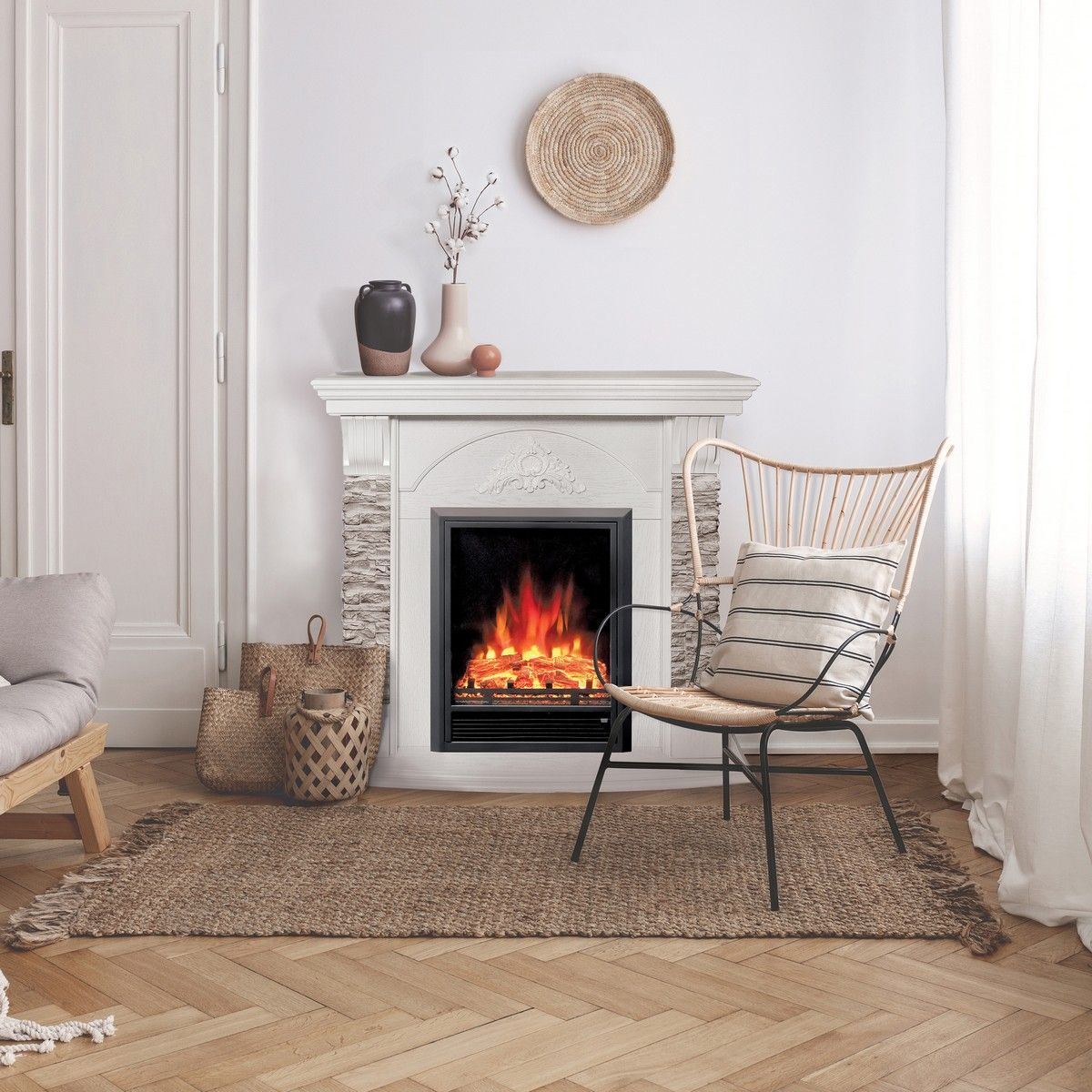 Электрический камин RealFlame Eugene — это обязательный предмет интерьера для вашей гостиной, кухни, спальни или прихожей его предназначением является украшение и декорация вашего дома или офисного помещения. Достигается это посредством имитации пламени на экране очага и конвекторного обогревателя встроенного в корпус. Двухуровневый тепловентилятор обогреет за полчаса любое помещение — спальню, кухню, его можно просто поставить на пол или встроить в каминное обрамление, в нишу или в мебель — есть датчик защиты от перегрева. Камин используют в любую погоду зимой, осенью или весной, в квартире или на даче. Летом можно не включать обогрев — проекционная технология пламени имитирующая настоящий огонь работает в независимом режиме. У электрического очага Eugene по мимо звуковой имитации потрескивания дров есть дополнительные особенности: Пульт ДУ, регулировка яркости пламени, таймер отключения. Камин достаточно универсален в выборе стиля и дизайна оформления помещения.
