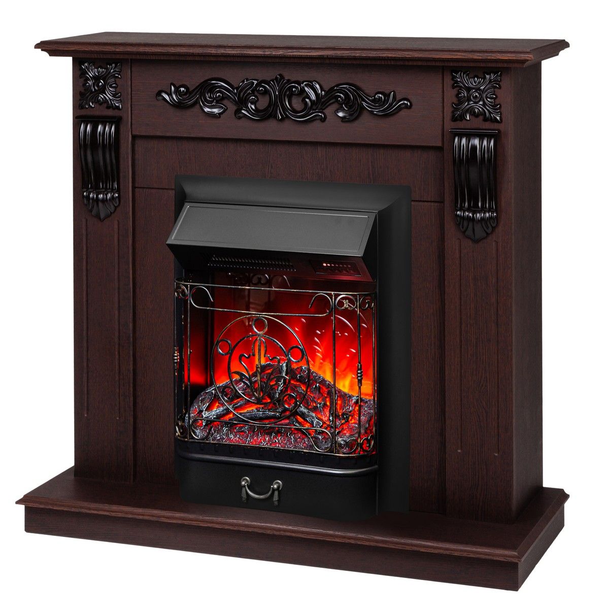 Электрический очаг Majestic Lux предназначен для встраивания в стандартные обрамления. Нагреватель с поддувом спрятан в козырьке очага и обеспечивает обогрев в прохладную погоду. Переключатель позволяет использовать два уровня мощности. В режиме визуализации пламени потребление электроэнергии составляет 80 Вт (две свечеобразные лампы E14 мощностью 40W).