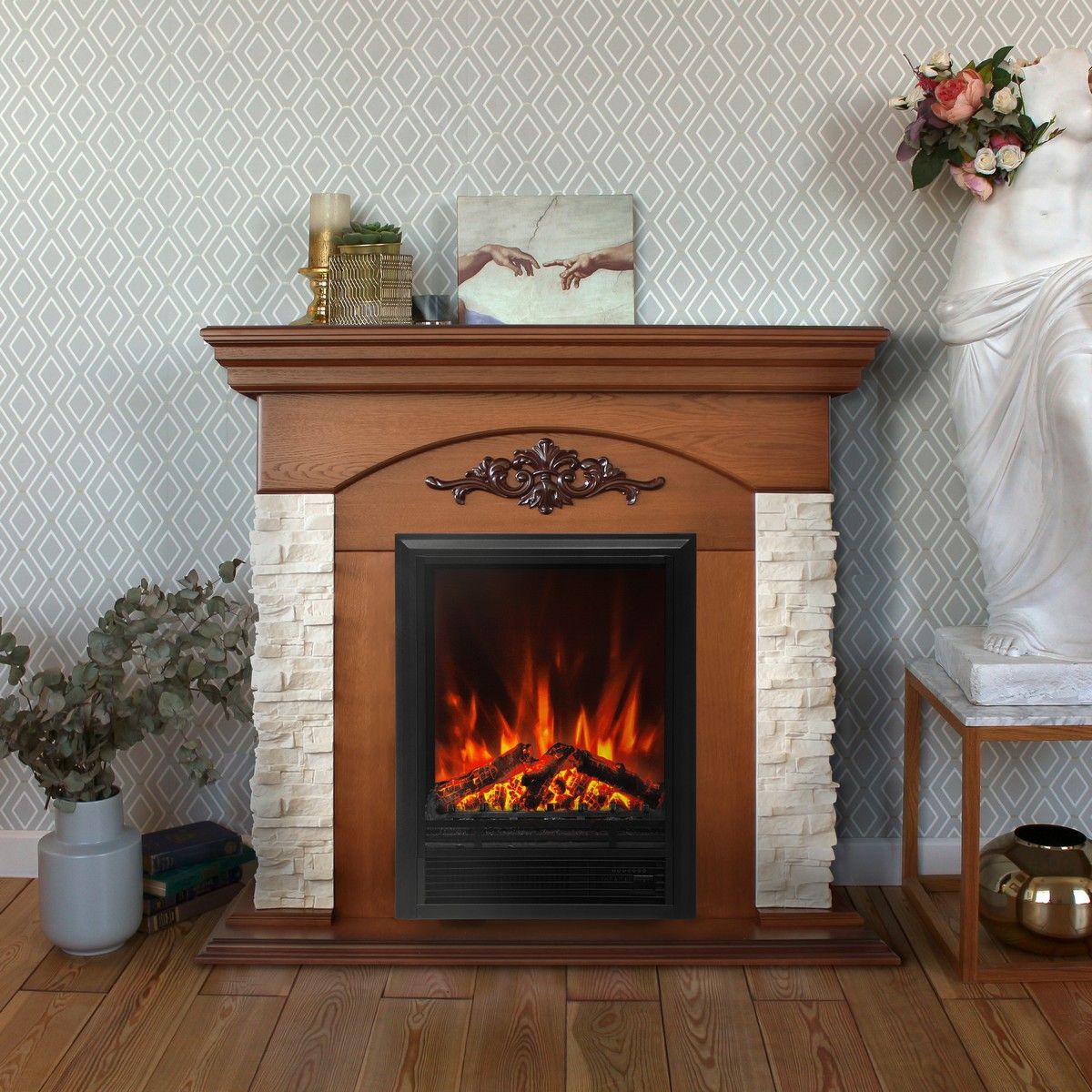 Электрический камин RealFlame Eugene — это обязательный предмет интерьера для вашей гостиной, кухни, спальни или прихожей его предназначением является украшение и декорация вашего дома или офисного помещения. Достигается это посредством имитации пламени на экране очага и конвекторного обогревателя встроенного в корпус. Двухуровневый тепловентилятор обогреет за полчаса любое помещение — спальню, кухню, его можно просто поставить на пол или встроить в каминное обрамление, в нишу или в мебель — есть датчик защиты от перегрева. Камин используют в любую погоду зимой, осенью или весной, в квартире или на даче. Летом можно не включать обогрев — проекционная технология пламени имитирующая настоящий огонь работает в независимом режиме. У электрического очага Eugene по мимо звуковой имитации потрескивания дров есть дополнительные особенности: Пульт ДУ, регулировка яркости пламени, таймер отключения. Камин достаточно универсален в выборе стиля и дизайна оформления помещения.
