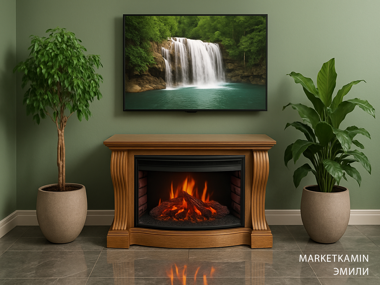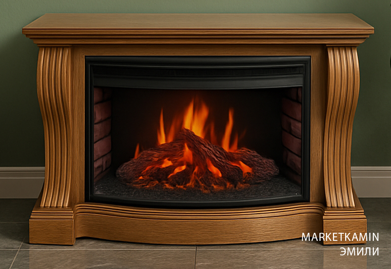 Цена за комплект с очагом Panoramic 33 с высоким панорамным стеклом″ LED: 99500 руб. Широкий очаг на светодиодах с выгнутым панорамным стеклом, ярким пламенем, натуралистичными дровами, кирпичной кладкой внутри топки. Регулировка яркости пламени. Работа с обогревом и без. Мощность обогрева 1,8 кВт. Термостат — климатконтроль для поддержания заданной температуры обогрева. Цифровой дисплей для отображения температуры обогрева и прочих режимов. Все функции с пульта ДУ . Звук потрескивающих дров.