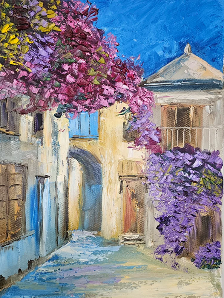 Городок в Греции. Картина маслом на холсте. Ручная работа. Без рамы. Размеры: ш 30 см, в 40 см