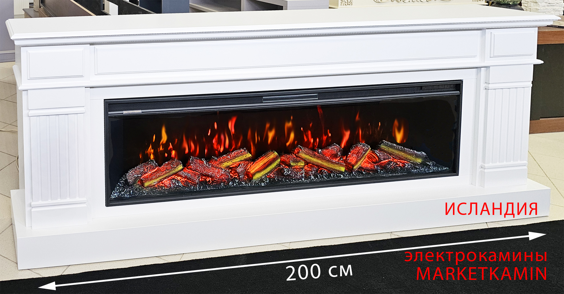 Исландия 2000 (белая эмаль) Очаги 60″ на выбор (дрова/кристаллы/паровые 3D) Габариты (ШxВxГ)2000x900x350 мм