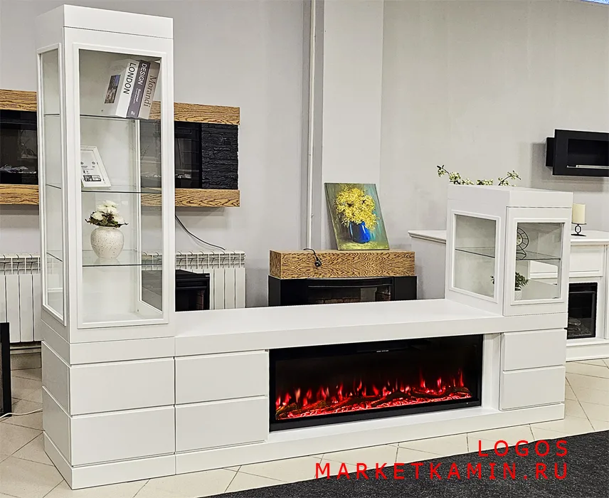 Каминный гарнитур/ТВ-тумба Логос с ассиметричными шкафами-витринами. Очаги на выбор (за стеклом дрова или кристаллы/открытые 3D с эффектом живого пламени и увлажнением) Габариты (ШxВxГ)2700x2100x400 мм