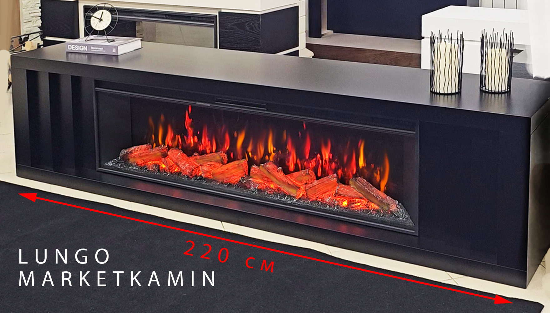 LUNGO 2200 (лунго чёрная эмаль) широкие очаги 60 дюймов на выбор (дрова/кристаллы/3D живое пламя) Цвет и размеры на выбор. Габариты (ШxВxГ): 2200х550х450 мм