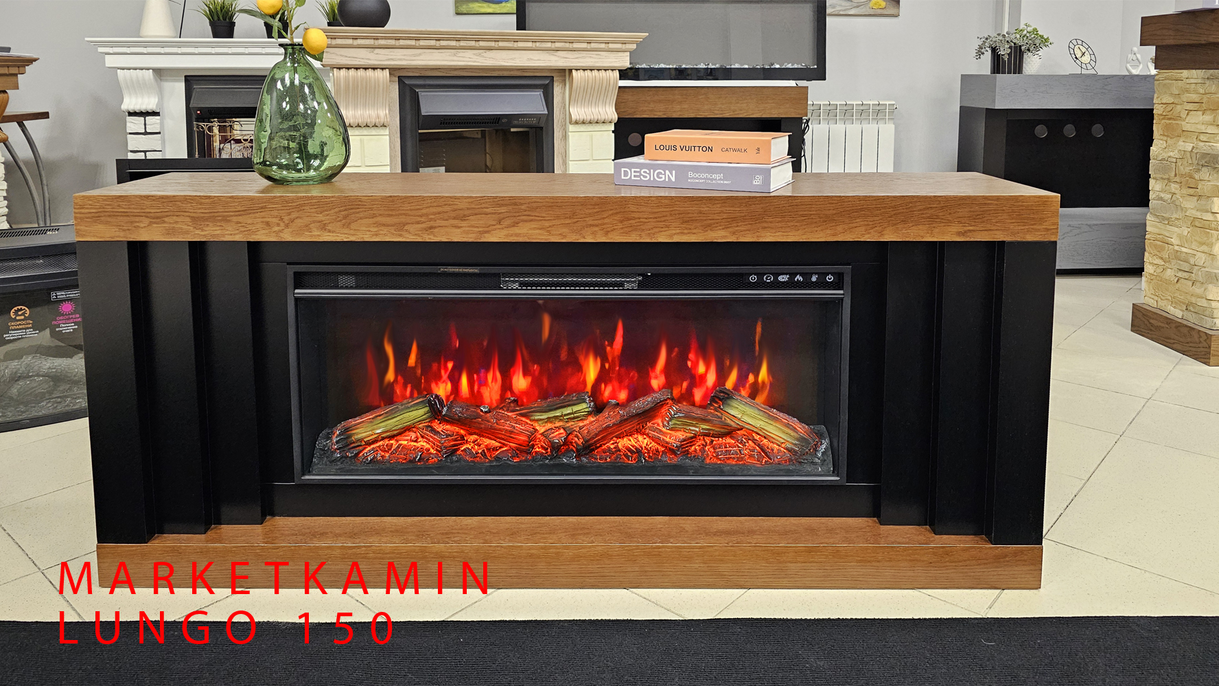 LUNGO150 (лунго орех/чёрная эмаль) Очаги 40″ на выбор (дрова/кристаллы/3D) Габариты (ШxВxГ): 1500х650х350 мм