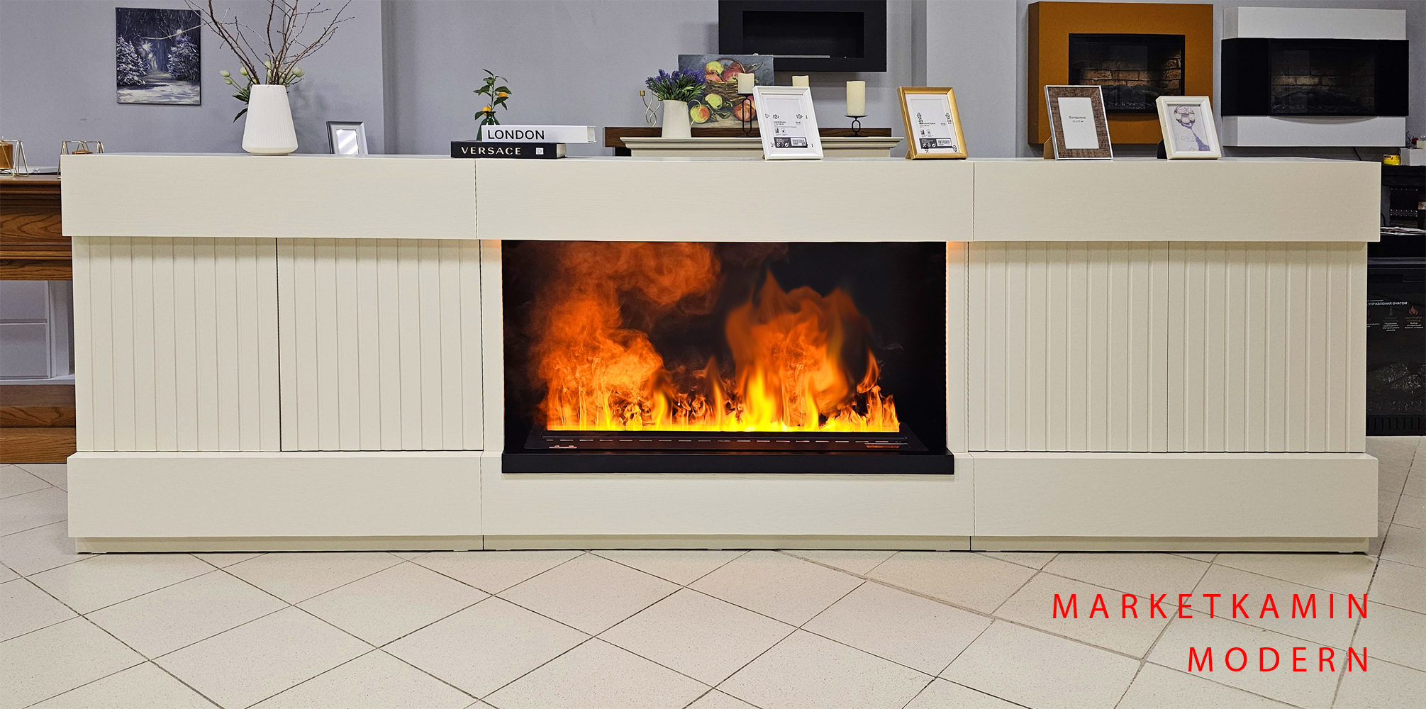 Modern (Модерн) Камин-бар/ТВ-тумба с рейками на дверках (слоновая кость) очаги с 3D эффектом живого пламени и увлажнением воздуха на выбор Габариты ШxВxГ: 3000х1000х300 мм