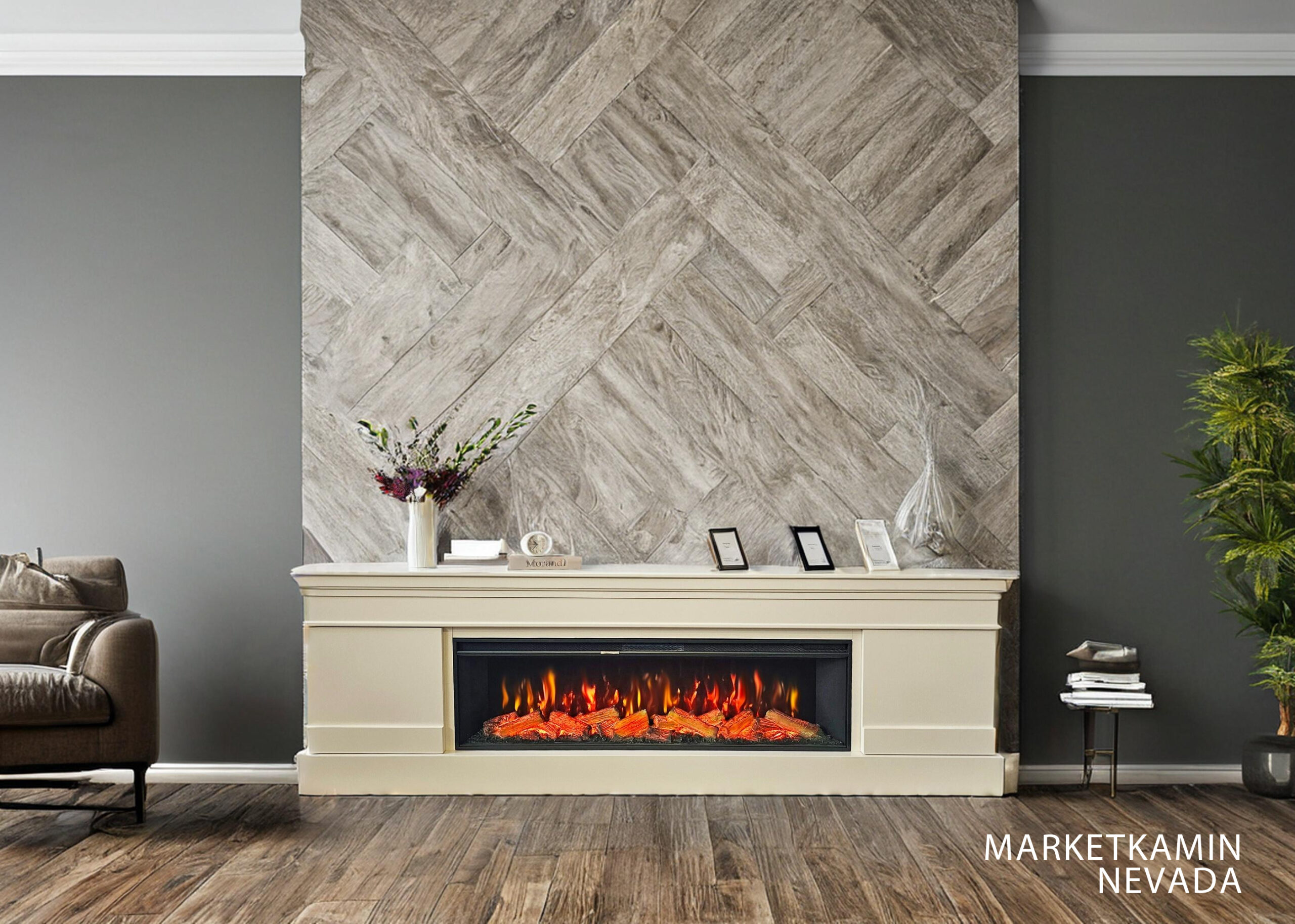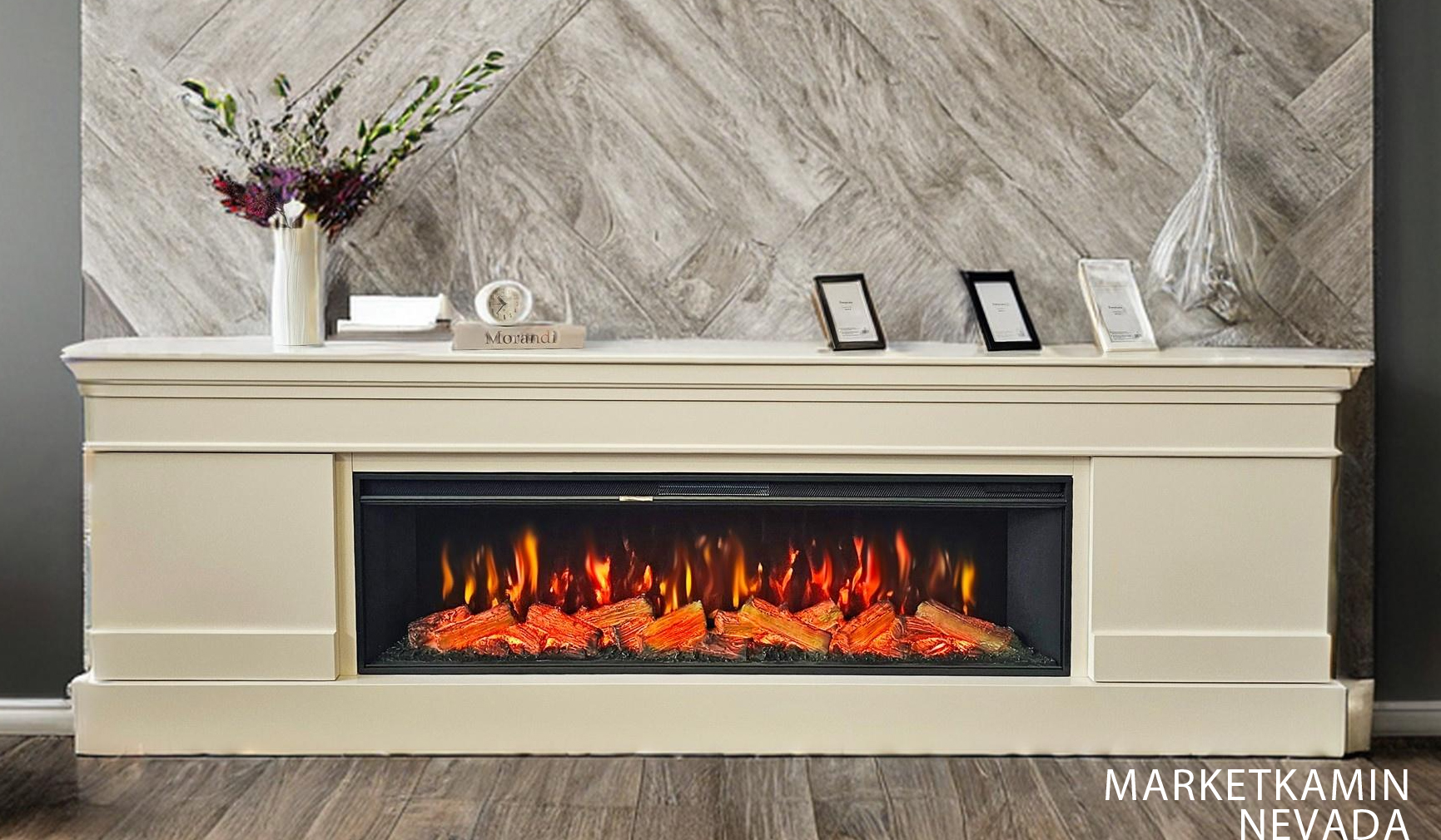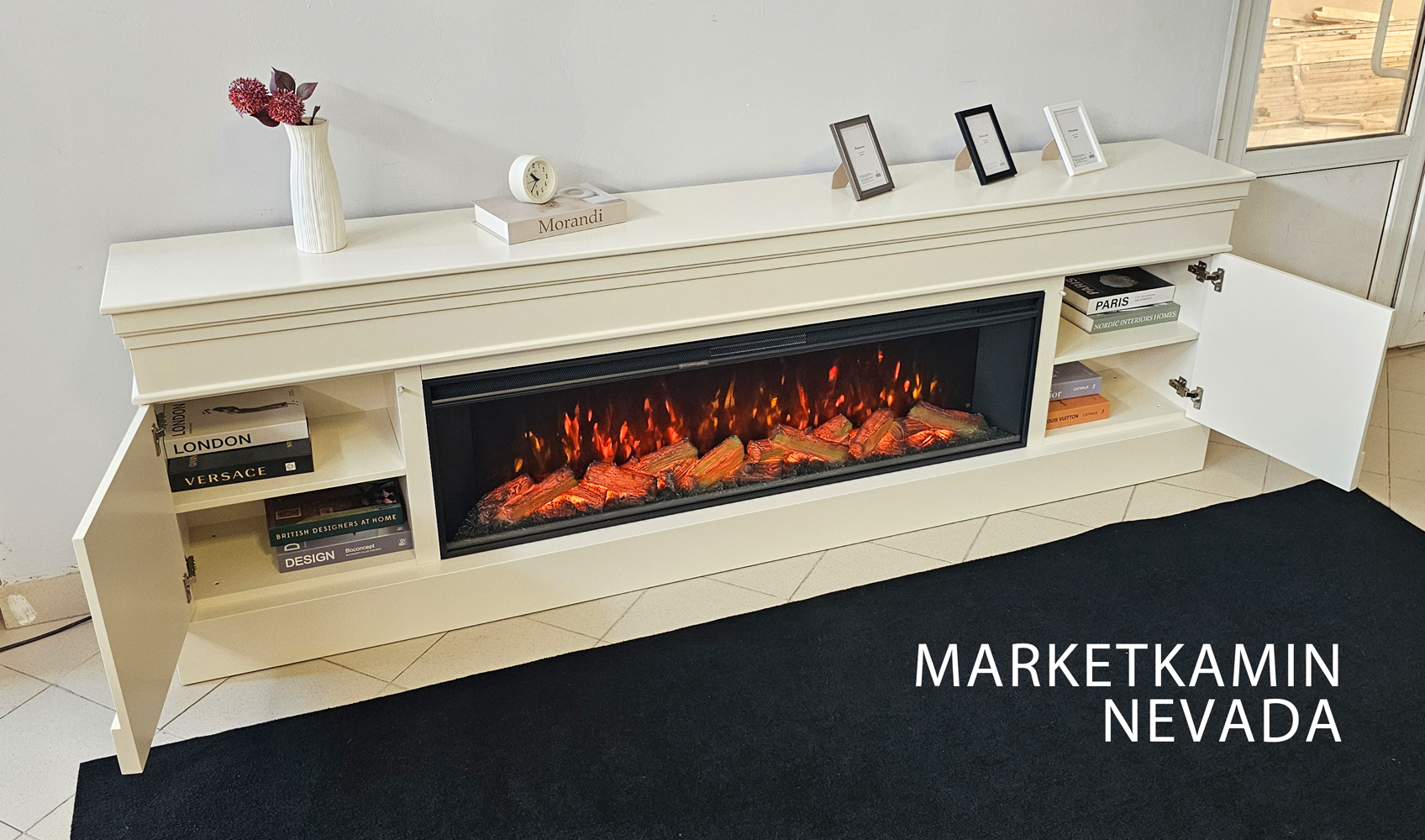 NEVADA 250 (Невада кремовая эмаль) камин-бар с дверками. Очаги 60 дюймов (дрова/кристаллы/3D живое пламя и увлажнение воздуха) Цвет на выбор. Габариты (ШxВxГ) 2500x800x350 мм