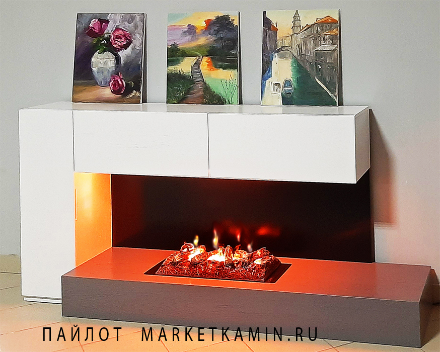 Пайлот. Камин-бар с дверкой и выдвижными ящиками. (Белая эмаль/серый дуб) Открытый очаг 3D с живым пламенем (варианты в описании) Габариты (ШxВxГ): 2000х1000х450 мм