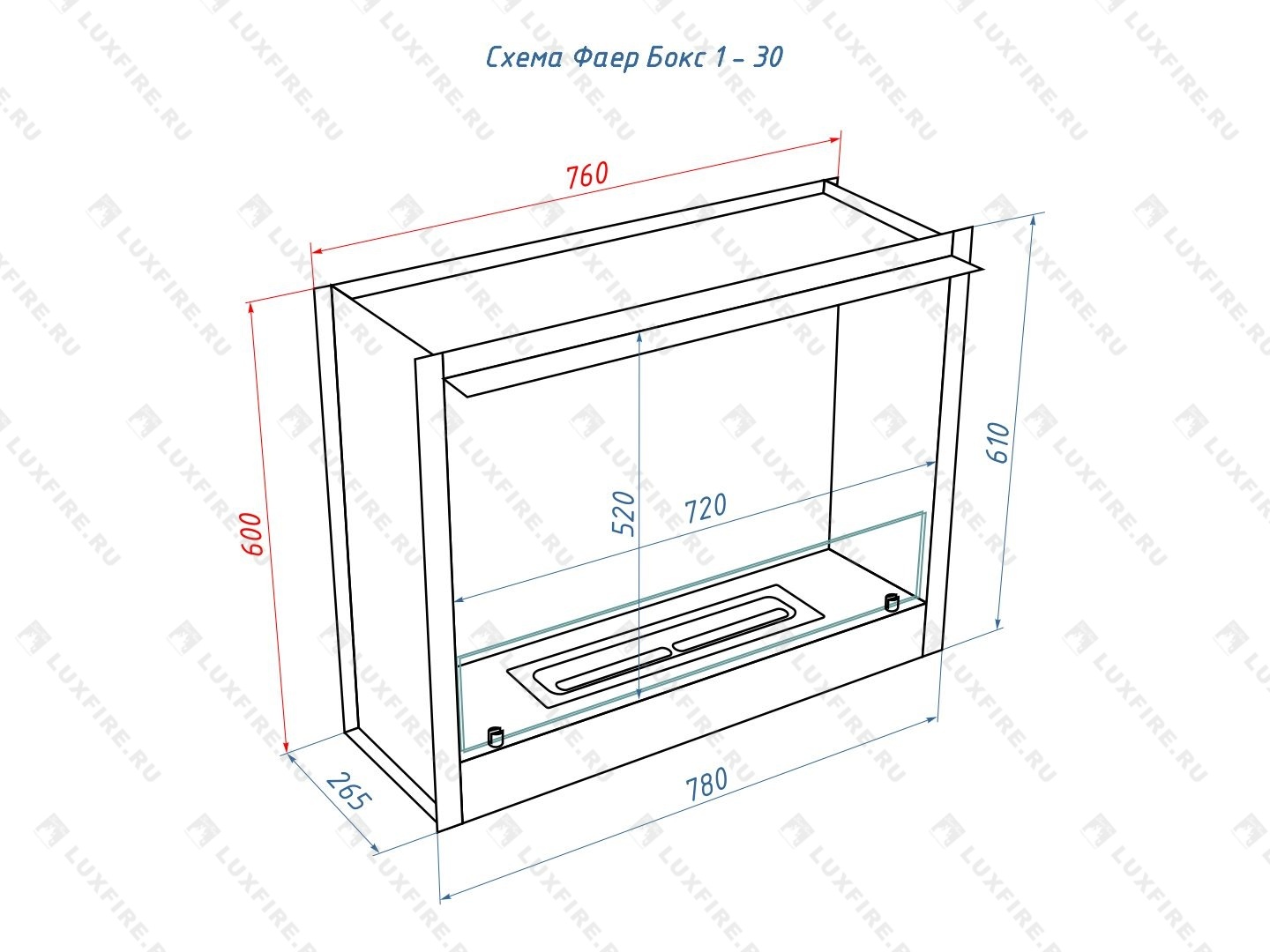 Портальный биокамин Lux Fire «Фаер Бокс 1 — 30» Размеры (ВхШхГ; мм) 610 х 780 х 265