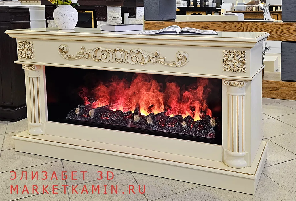 ELIZABETH 145 (Элизабет слоновая кость с золотой патиной) Очаги с 3D эффектом живого пламени и увлажнением воздуха на выбор. Габариты (ШxВxГ)1450x750x400 мм