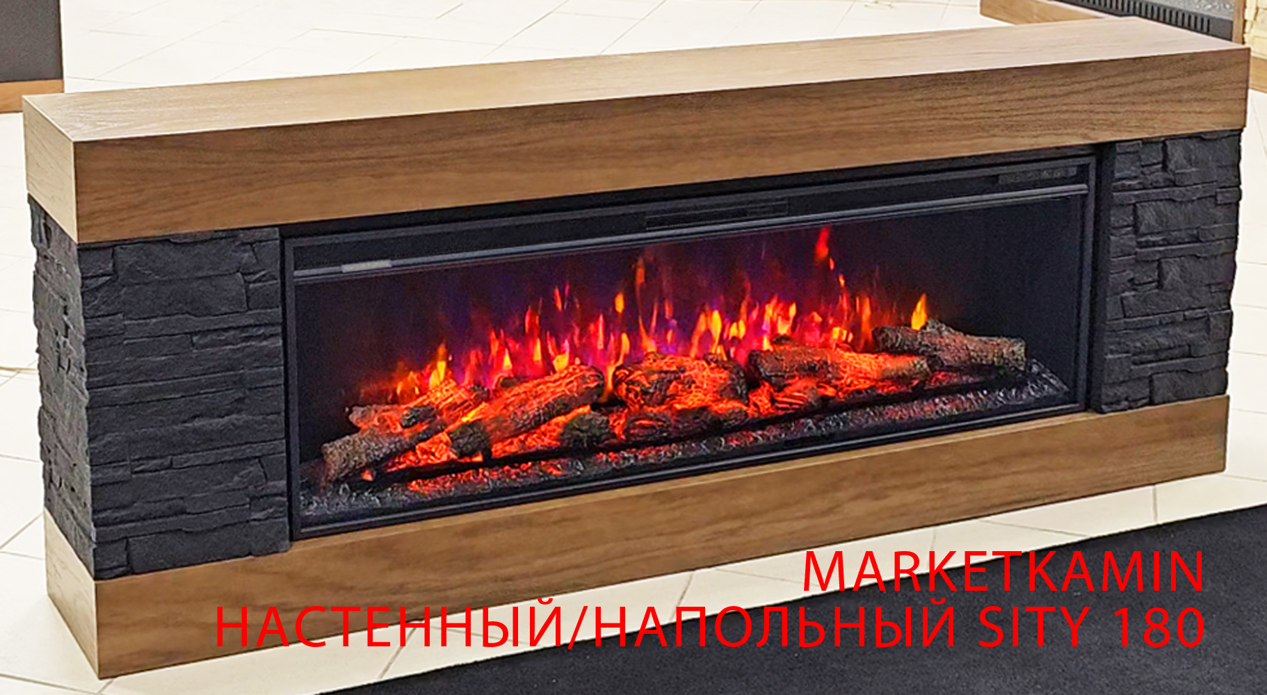 CITY 180 (Сити светлый орех/чёрный сланец) Настенный/напольный камин. Варианты очагов в описании (дрова/кристаллы) Габариты (ШхВхГ) 1800×700х170-250 мм