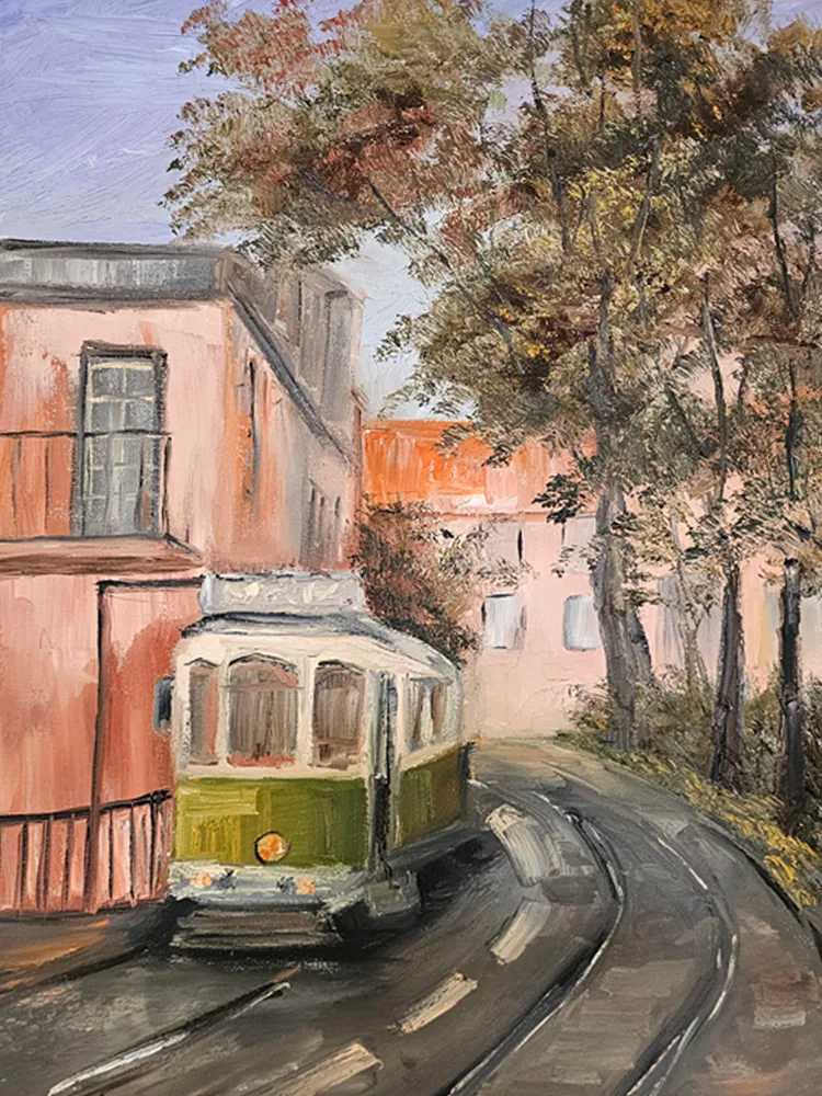 Старый трамвай. Картина маслом на холсте. Ручная работа. Без рамы. Размеры: ш 30 см, в 40 см