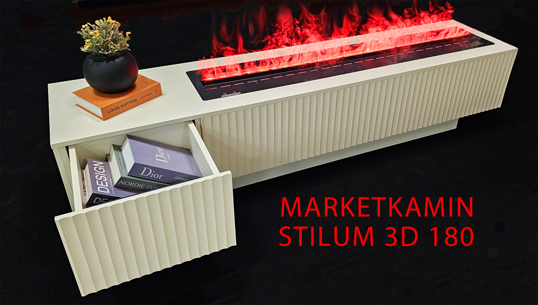 Стилум камин-тумба с рифленым фасадом и выдвижным ящиком (светло-бежевая эмаль) Очаги с открытым 3D пламенем. Варианты в описании Габариты (ШxВxГ): 1800х400х400 мм