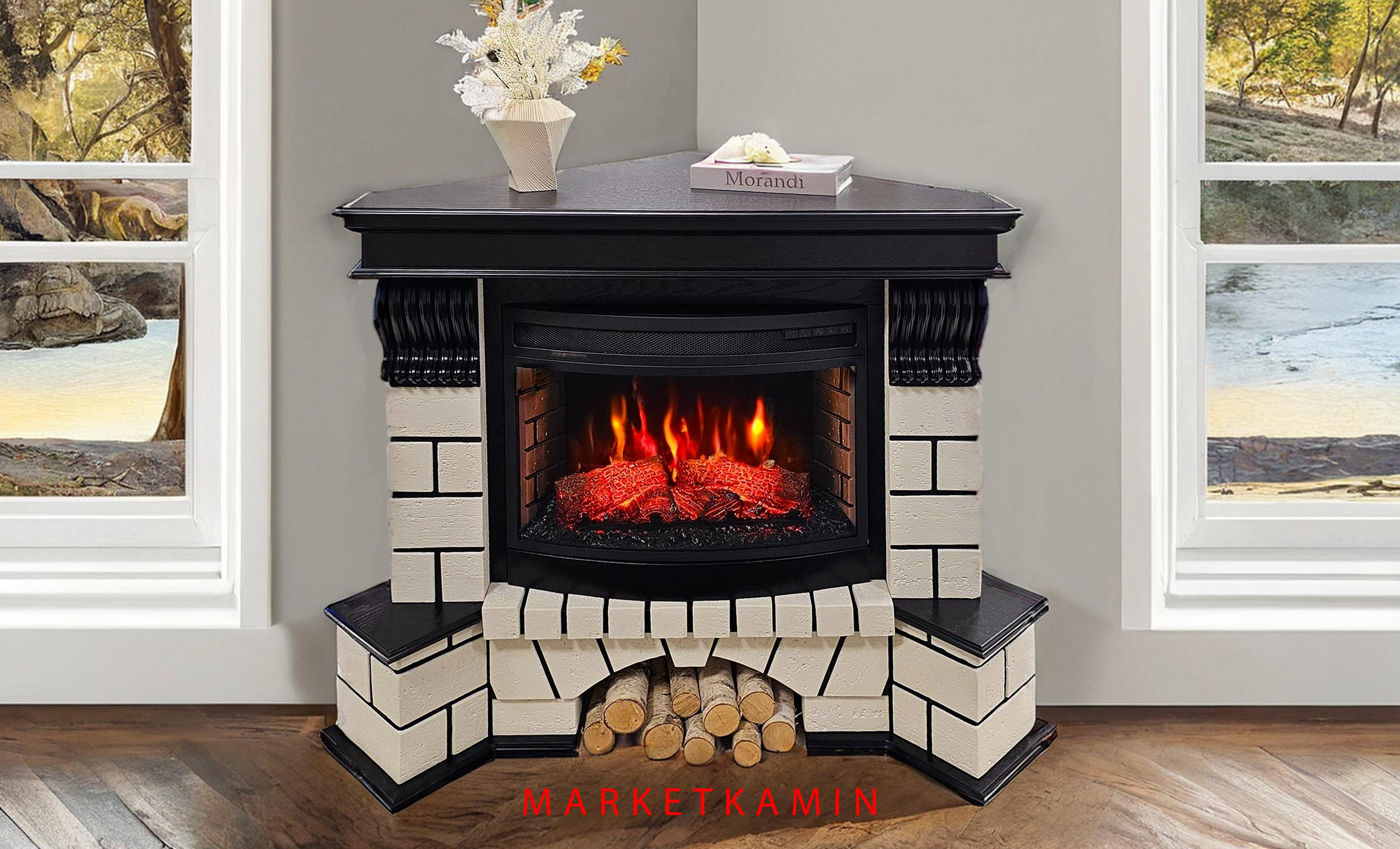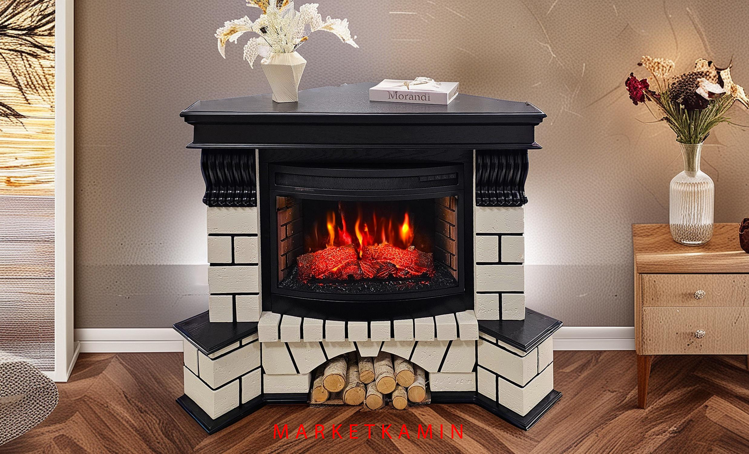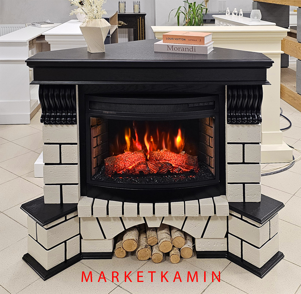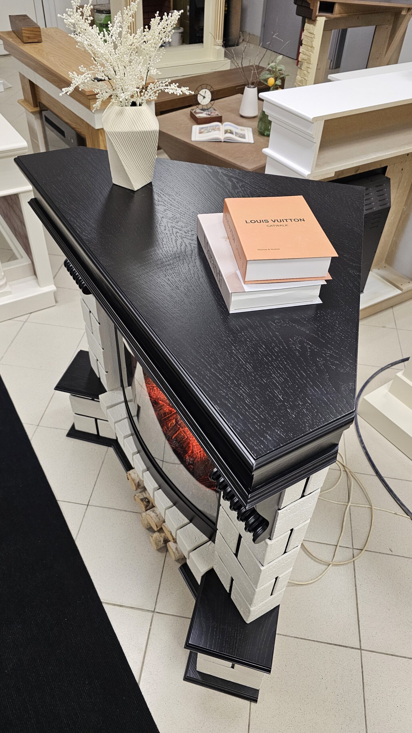 Размеры: ширина по низу 1300 мм, ширина по крышке 1150 мм, высота 1050 мм, глубина от фасада до угла 780 мм. Классический камин в угловом варианте с отделкой из дерева и декоративного кирпича с текстурой травертин в светло-бежевом цвете с чёрной расшивкой швов. Угловая крышка камина и другие деревянные детали покрыты натуральным шпоном дуба в чёрном цвете. Снизу камина имеется ниша, которую по вашему желанию можно заполнить, например, настоящими поленьями.