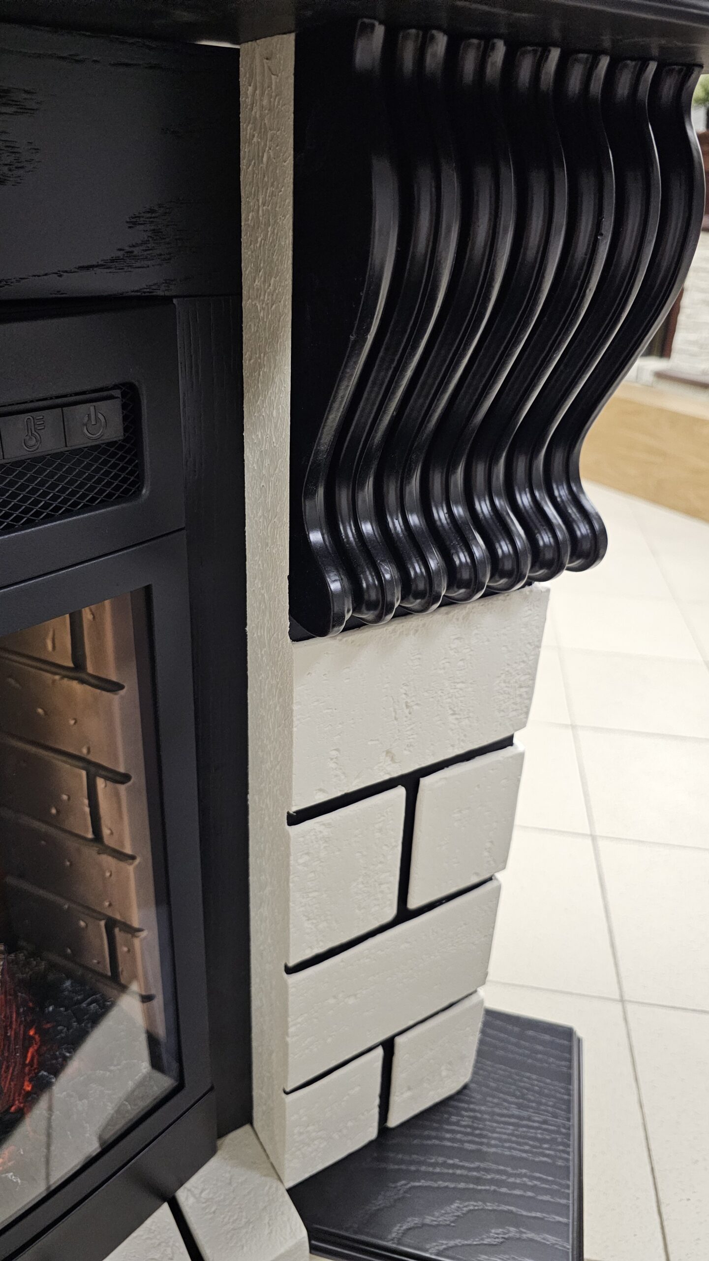 STONE LUXE (стоун) Угловой с развёрнутым основанием. Чёрный дуб/светлый кирпич. Панорамный очаг 25″ Размеры: ш 1300, в 1050, г 780 мм