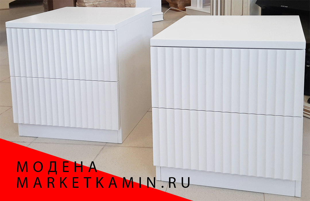 Модная тумбочка с двумя выдвижными ящиками. На фасадах ящиков вертикальные полосы-фрезеровки.