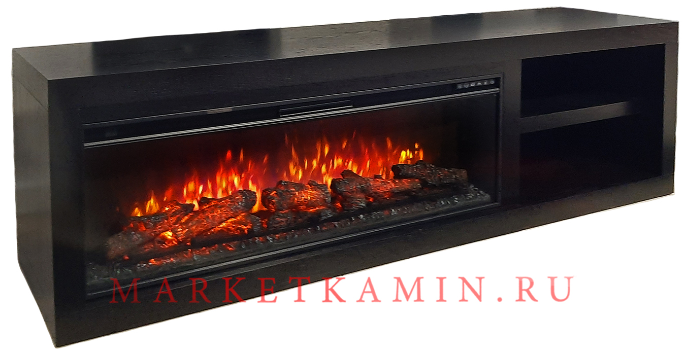 ТВ-тумба Дельта с открытой полкой (чёрный дуб) Очаги 50″ на выбор (дрова/кристаллы/3D эффект живого пламени) Габариты (ШxВxГ): 2100х600х450 мм