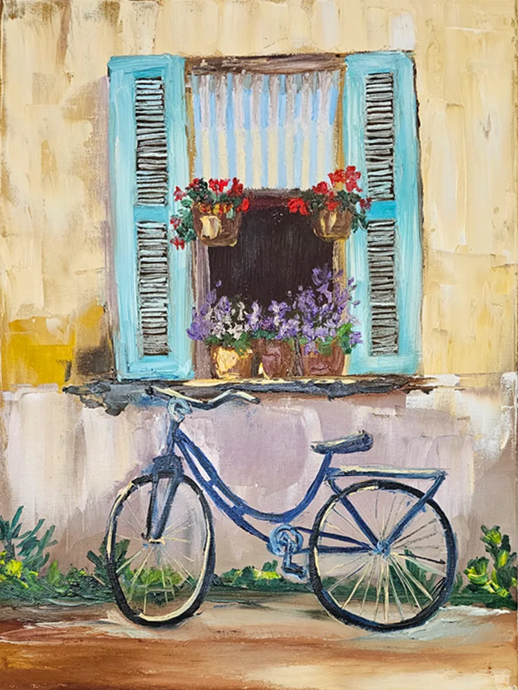Велосипед у окна. Картина маслом на холсте. Ручная работа. Без рамы. Размеры: ш 30 см, в 40 см